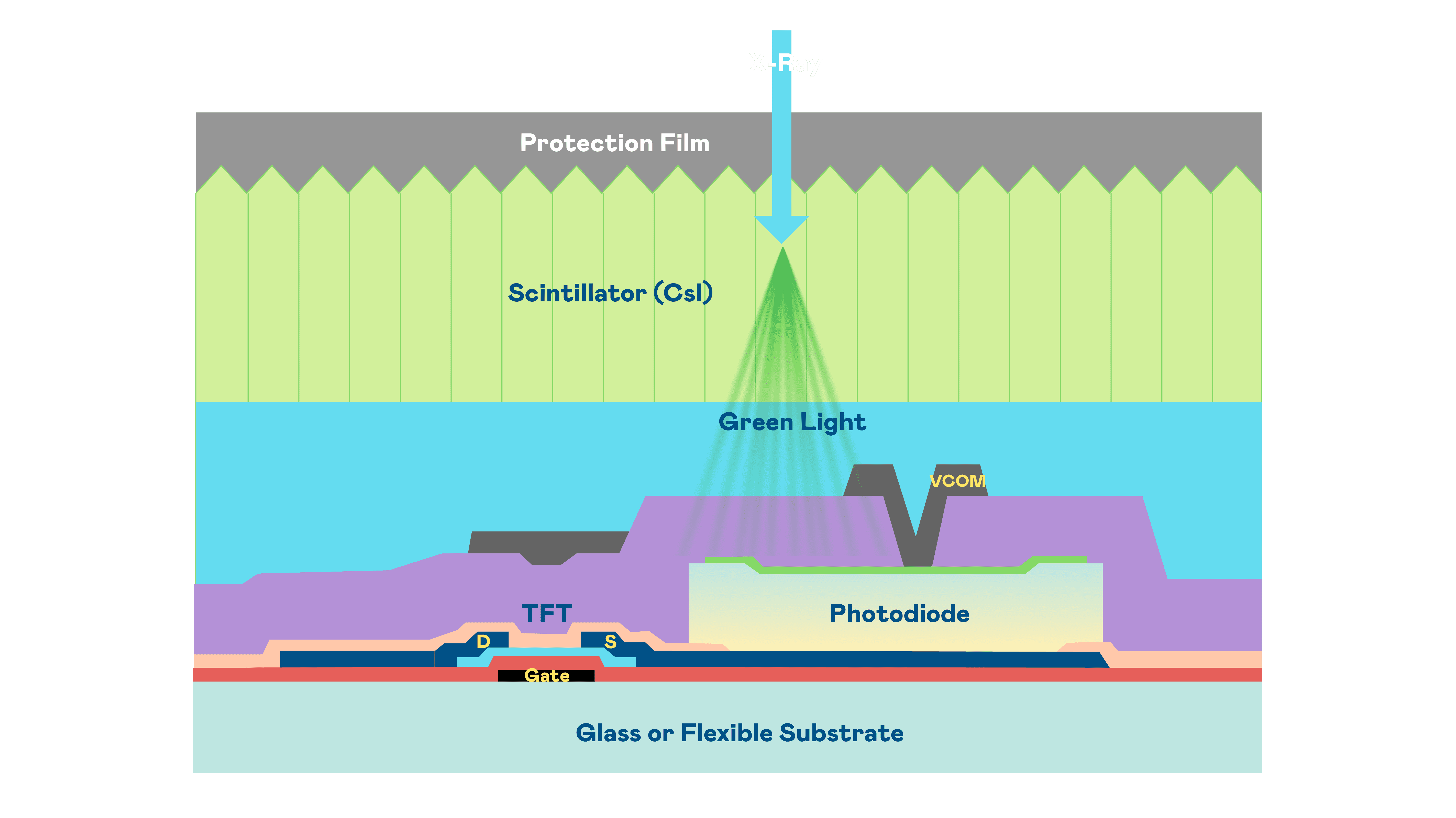 彩运网的X光影像感测阵列使用薄膜电晶体 (TFT) 作为每个像素的读取开关,,,搭配光电二极体(Photodiode)的光电转换元件,,用以感测X光影像讯号。。。